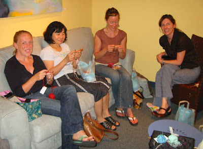 Thirteen yarns were sampled. We had a rating system so we could find out what the favorites are. First a list of the yarns tasted: Noro Cotton Hill, Fleece from Knit One Crochet Too, Lorna's Laces Sock, Tao Silk from Colinette, Mission Falls Cotton, Rowan Cashsoft, Louisa Harding Sari Ribbon, Malabrigo Worsted, Blue Sky Alpaca Dyed Cotton, Be Sweet Bamboo, Mango Moon Bali Sky and Capelli, and Misti Alpaca Chunky.